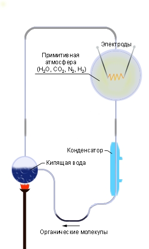 | Рисунок C.3.2. Схема опыта Миллера – Оро. Эксперимент подтверждает, что жизнь на Земле возникла в результате обычных химических реакций