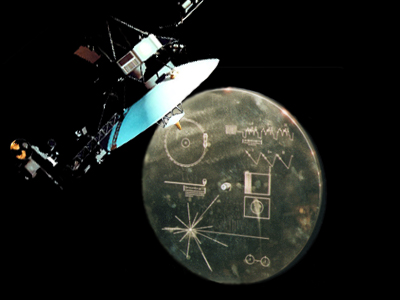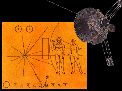 Запущенные в семидесятых годах «Пионер-10» и «Пионер-11» несут в себе металлические пластинки, на которых выгравированы силуэты мужчины и женщины на фоне космического корабля, Солнечная система и траектория «Пионера», схема атома водорода и положение Солнца по отношению к наиболее ярким галактическим пульсарам. Спустя пять лет на «Вояджерах» отправились в путь два диска, на которых собраны виды Земли, животного и растительного мира, фотографии человека и схемы его строения, важнейшие научные сведения, а также голоса человека и животных, шум ветра и океанский прибой, образцы человеческой речи и классическая музыка.