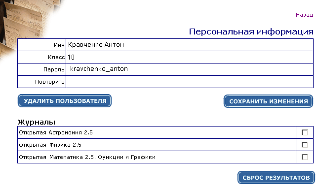 В таблице "Персональные журналы учеников" приведен список учеников, зарегистрированных в системе. Щелкнув по имени конкретного ученика из списка, можно перейти к разделу "Персональная информация", где имеется возможность изменения учетных карточек пользователей (имя и фамилия, класс, пароль) и удаления пользователей, а также сброса результатов журнала курсов, напротив которых справа установлены флажки. Если вы хотите изменить пароль ученика, не забудьте ввести этот пароль дважды: в полях "Пароль" и "Повторить".