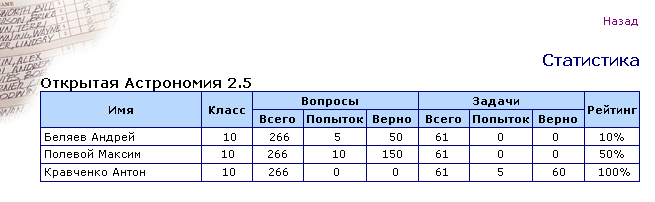 Результаты тестирования в таблице "Статистика" отображаются по курсам; доступны имя и класс ученика, общее количество заданий, количество решавшихся заданий, заданий решенных правильно, а также рейтинг ученика. Рейтинг подсчитывается как процент вопросов и задач, на которые даны правильные ответы, от общего числа заданий с весовым коэффициентом, зависящим от сложности задачи.