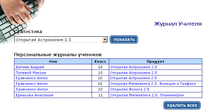 Если у вас установлены сетевые версии других курсов компании ФИЗИКОН ("Открытая Физика 2.6", "Открытая Химия 2.6" или др.), то в "Учительском интерфейсе" отражаются журналы и этих курсов. Для доступа к такому курсу установите соответствующее значение в выпадающем списке "Статистика".
