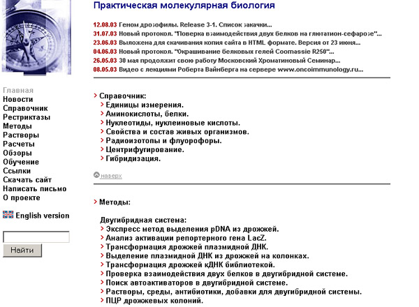 | Удобный и тщательно продуманный ресурс, созданный молекулярными биологами для молекулярных биологов. Учебные пособия, обзор методик исследования и программного обеспечения, удобная навигация и предусмотренная авторами возможность создания оффлайновой версии сайта. http://molbiol.ru/protocol/ – База данных по различным методам молекулярной биологии, которые применяются в биотехнологии. Большой и очень хороший гипертекстовый учебник, содержащий «суммы технологий» современной молекулярной генетики, необходимые как для понимания сути генно-инженерных работ, так и для практической деятельности в высокотехнологичных направлениях биотехнологии. | |||