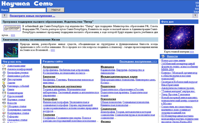 | Созданный при поддержке Фонда «Возрождение» проект публикует в Интернете научные статьи и книги высокого уровня, написанные выдающимися современными учеными. Все материалы иллюстрированы схемами и рисунками. Хорошо развитая систем поиска по сайту позволяет легко найти статьи нужной тематики. | |||