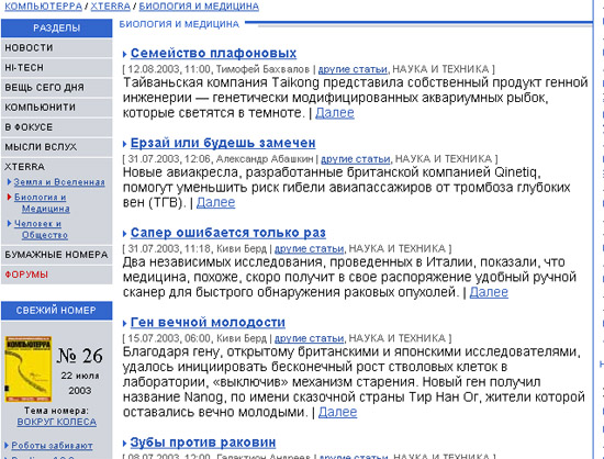| Медико-биологический раздел научно-популярного онлайнового журнала «xTerra», один из проектов одного из старейших компьютерных «бумажных» журналов «Компьютерра». Постоянное обновление информации, доступность изложения материала. | |||
