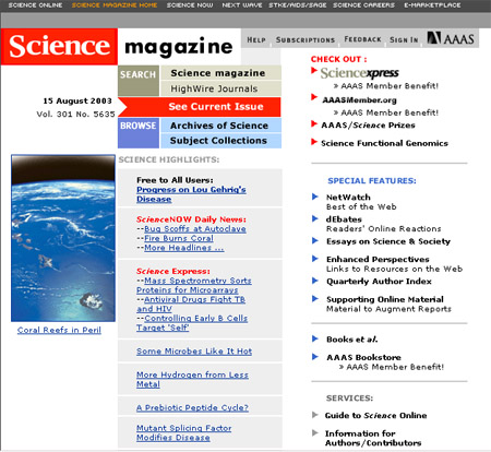 | Электронная версия журнала «Science». Еженедельный научный журнал публикует результаты научных исследований и обзорные статьи в области естественных наук (экологии, физике, молекулярной биологии, науке и политике, биохимии, химии), техники, экономики, медицины, образования. Здесь помещаются сообщения о конференциях, обзоры новых книг, информация о новом лабораторном оборудовании и приборах. Электронная версия журнала значительно расширяет поисковые возможности, позволяя вести поиск по ключевым словам, авторам, названию статьи, дате публикации и т. д. Многие статьи включают специальные on-line компоненты: приложения, аудио и видео материалы. | |||