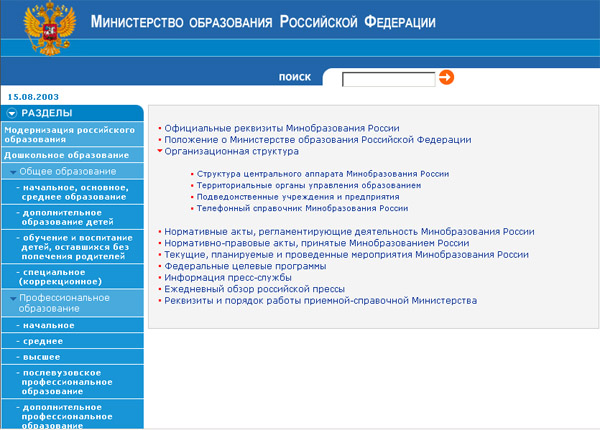 | На сайте представлена официальная информация о Минобразования России: организационная структура центрального аппарата, территориальных органов управления образованием, подведомственные учреждения и предприятия; нормативно-правовые акты (как регламентирующие деятельность Министерства, так и принятые Минобразованием России), информация о федеральных целевых программах, обзор текущих, планируемых и проведённых мероприятий. Представлен также ежедневный обзор российской прессы и сообщения пресс-службы министерства. | |||