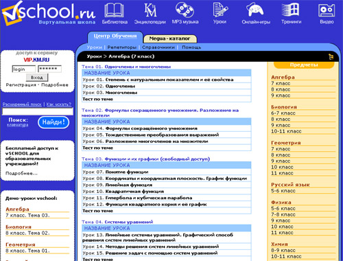 | Относительно новый проект одного из мощнейших русских порталов «Кирилл и Мефодий» (http://www.km.ru/), хорошо известного своими энциклопедиями – онлайновыми и распространяемыми на компакт-дисках. Новый проект посвящён ученикам и учителям, и хотя не все предметы представлены одинаково полно, он развивается и растёт почти на глазах. Стильный дизайн, удобная навигация, оригинальность идей в оформлении рубрик и осторожный юмор авторов создают неповторимую атмосферу сайта, в которой приятно работать. | |||