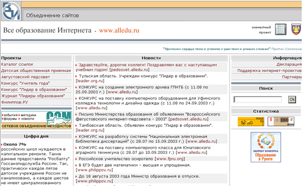 | «Всё образование Интернета» – совместный проект Федерации Интернет-образования и Фонда поддержки российского учительства. На сайте представлена актуальная информация о педагогических конкурсах («Учитель года», «Лидер в образовании»), широко известном Интернет-проекте «Августовский педсовет» и материалы журнала «Лидеры образования». Работает также «Детская общественная приемная», имеется каталог веб-ссылок. | |||