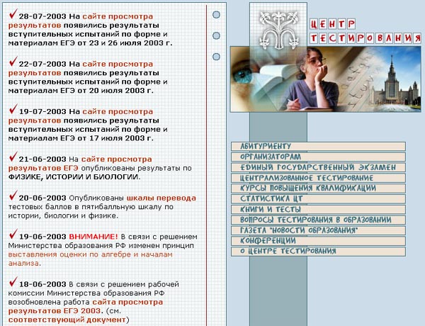 | Веб-сервер Центра тестирования организован для информационной поддержки деятельности Центра по развитию системы централизованного тестирования и единого государственного экзамена. Представленные на сервере материалы должны заинтересовать учащихся, выпускников, их родителей, учителей, работников управления образованием, преподавателей и руководителей вузов. Центр тестирования предпринимает все усилия для обеспечения высокого качества предоставляемой услуги, позволяющей получить объективную информацию об учебных достижениях учащихся по разным предметам, достоверности представленных на сайте материалов, их регулярного обновления и дополнения последней информацией по вопросам централизованного тестирования в России. Результаты централизованного тестирования, указанные в сертификатах Центра, в соответствии с приказом министра общего и профессионального образования РФ могут, по желанию учащихся, засчитываться в общеобразовательных учреждениях (школах, гимназиях, лицеях) по всем предметам (кроме литературы и алгебры и начал анализа) в качестве оценок итоговой аттестации и в вузах в качестве оценок вступительных испытаний. | |||