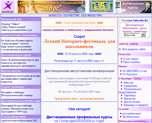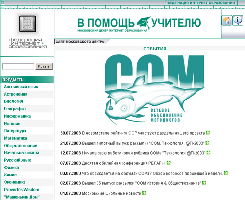 | Один из центров дистанционного образования, работающий с общеобразовательными школами. Предлагает учителям систему курсов и мастер-классов по использованию современных информационных и телекоммуникационных технологий в учебном процессе (а также проводит ежегодный конкурс «Дистанционный учитель года»), а ученикам – творческие Интернет-проекты и дистанционные эвристические олимпиады по предметам, профиль-классы с возможностью углубленного изучения отдельных тем и разделов школьной программы. | |||