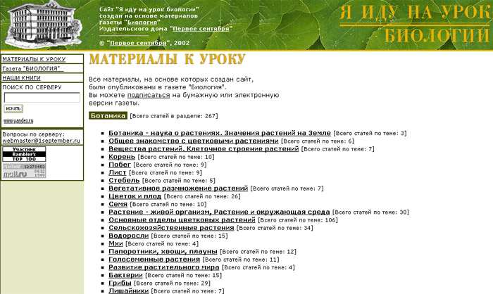 | Мощный образовательный ресурс, объединяющий практически все направления педагогической деятельности и нацеленный на удовлетворение реальных профессиональных потребностей учителей-предметников. Для каждого из предметов приводятся конкретные разработки уроков, теоретические статьи, задания для тестовой проверки знаний, отобранные веб-ссылки и многое другое. Биология в «Августовском педсовете» (http://center.fio.ru/som/subject.asp?id=10000811) – раздел для учителей биологии. | |||