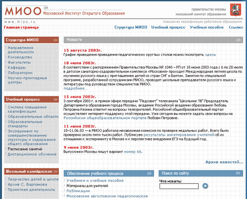 | МИОО в 2002 г. получил федеральный грант на создание образовательного портала, который должен стать одним из крупнейших ресурсов системы просвещения. На нем представлены проекты и подразделения института, ведётся большая работа по каталогизации и аннотированию существующих образовательных ресурсов Интернета. | |||