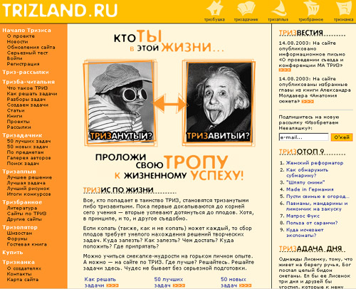 | Это сайт о теории решения изобретательских задач (ТРИЗ). Сайт предназначен как для новичков, так и для профессионалов ТРИЗ. Цель проекта состоит в том, чтобы познакомить людей с ТРИЗ, и что главное – помочь научиться технике решения творческих задач в различных областях человеческого знания. Сначала – простые задачи, потом – сложнее. И в этом помогут творческие задачи, собранные в огромном количестве на сайте на различные темы (биология, физика, химия, бизнес, реклама, техника, сказочные, фантастические и др.), а также различные форумы, статьи, книги, конкурсы. Сложные задачи по биологии – http://www.trizland.ru/tasks.php?mode=all&tid=24&lid=3. | |||