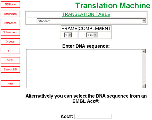 | Онлайновая программа, осуществляющая перевод с нуклеотидных последовательностей на аминокислотные. Представлена возможность выбора разных вариантов генетического кода (основной, бактериальный, митохондрий разных организмов и т. п.). | |||
