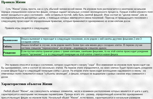 | «Эволюция», или «Жизнь» Джона Хортона Конвея – игра, которая базируется на теории клеточных автоматов. Подробный рассказ об игре на сайте «истинного жизнелюба» из Киева В. Скляра (http://elvisti.kiev.ua/skl/conwey1/w_life_n.htm), там же можно найти небольшой java-апплет, который позволяет наблюдать процессы рождения, развития и гибель популяций непосредственно в веб-странице. | |||