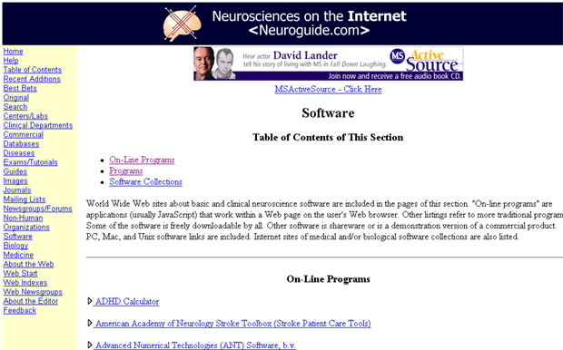 | Представленные на сайте программы разделены на три категории: on-line programs (онлайновые программы), Programs (программы), software collections (коллекции программного обеспечения). Представлены веб-сайты с программным обеспечением для исследований в области общей и клинической неврологии. В разделе «on-line programs» представлены приложения (преимущественно JavaScript), которые работают на веб-страницах, отображаемых браузерами пользователей. Следующий раздел содержит более традиционные программы. Часть программного обеспечения может быть бесплатно загружена и установлена, другие представляют собой демонстрационные версии коммерческих продуктов; представлены программы для разных операционных систем. Также включены ссылки на Интернет-сайты с медицинским и биологическим программным обеспечением. | |||
