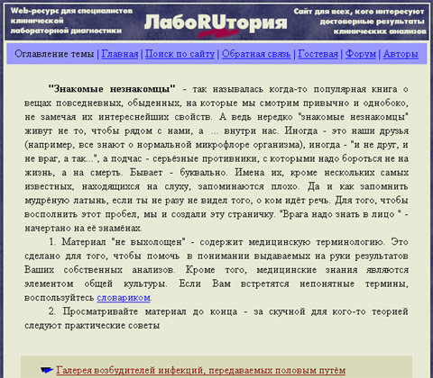 | Данная ссылка отправит вас на страницу «Галерея возбудителей инфекций, передающихся половым путем», на которой можно подробно познакомиться с вирусами (например, иммунодефицита человека или цитомегаловирусом), бактериями (от гонококков и спирохет до кишечной палочки Escherichia coli), простейшими и даже насекомыми и клещами. Блестяще иллюстрированный электронными микрофотографиями, дополненный словарем медицинских и научных терминов сайт (разработчики честно сознались, что они «не стали выхолащивать сайт, удаляя научные термины» уже потому, что эти сроки могут встречаться в врачебных диагнозах и рекомендациях для пациентов, которым в первую очередь адресован сайт и для который приведены подробные объяснения из диагностики и лечения заболеваний). Но и («тьфу, тьфу, тьфу» :-) здоровые пользователи будут заинтересованы как эффектностью подачи материала, так и современным дизайном ресурса. | |||