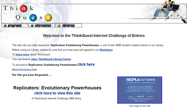 | Что такое «репликаторы», как они влияют на эволюционный процесс? Почему их называют «движущей силой эволюции»? Отвечает на этот вопрос сайт, созданный американкой Кэйт Стеффорд и двумя школьниками из Челябинска – С. Титовым и В. Исаевым, основанный на взглядах Р. Доукинза, изложенных в книге «Эгоистический ген». Сайт «Explore the World of Replicators» – призер конкурса ThinkQuest (TQ), проводимого некоммерческой организацией Advanced Network & Services, Inc. Правила, новости и рекомендации для тех, кто желает принять участие в конкурсе TQ, на веб-сайте http://www.thinkquest.org, сайтотека конкурса – http://www.thinkquest.org/library/index.html. | |||