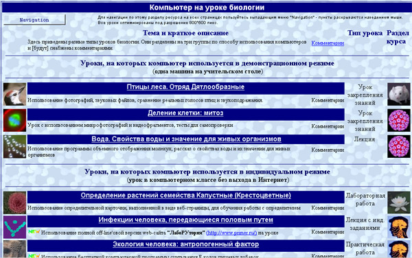 | Уроки биологии с разным режимом использования компьютеров – в демонстрационном режиме (одна машина с большим экраном или проектором), компьютерный класс с подключением к Интернету или без него. Восемнадцать конкретных уроков, которые демонстрируют примеры рационального использования вычислительной техники на уроках биологии. На сайте также имеются статьи о дистанционном образовании и рейтинговой системе, компьютерные программы, используемые в преподавании биологии, другая полезная для учителей информация. | |||