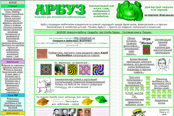 | Сайт «Арбуз» (Фергана, Узбекистан), автор сайта – Евгений Скляревский. На этом научно-популярном сайте можно найти рассказы о новостях науки и техники, химические, биологические и математические развлечения, ссылки на некоторое нераспространённое программное обеспечение и много интересного. | |||