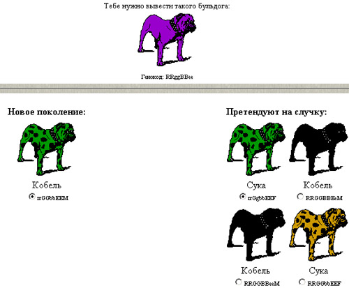 | На сайте культового русского детективщика Бориса Акунина в качестве своеобразной иллюстрации к повести «Пелагия и белый бульдог» Артемием Лебедевым создан «Питомник бульдогов», в котором вам будет предложено вывести свою породу бульдогов с определенным генотипом из имеющихся и доступных для скрещивания особей с известными генотипами. Если через несколько поколений скрещиваний Вам удастся получить желаемую породу, считайте, что Вам повезло большее, чем одной из героинь Б. Акунина. Но будьте внимательные, так как если вы ошибетесь, Вас пристыдят так, что Вы долго будете рассказывать об этом друзьям… Посетите, не пожалеете – очень интересный генетический опус. | |||