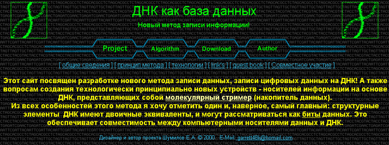 | Кодирование информации в виде нуклеотидов ДНК на личной странице любителя наследственной и прочей информации Е. А. Шумилова из Владивостока. Сайт отличает своеобразная свежесть взгляда на генетическую информацию – он основан на идее (и даже предлагает специальную программу для этого) кодировать обычные фразы типа «Маша, я по тебе соскучился!» в виде последовательности нуклеотидов: аденина, гуанина, тимина и цитозина. Кроме того, в других разделах сайта можно найти словарь терминов и популярный рассказ о современных ДНК-технологиях, в том числе полимеразной цепной реакции. | |||