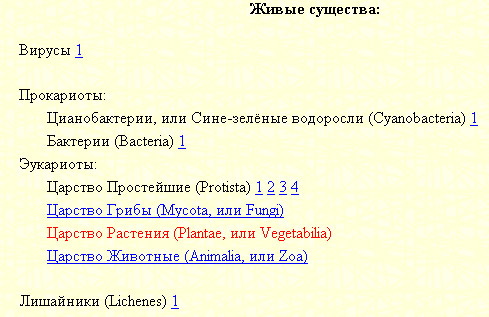 | Личная страница, посвященная многообразию живых организмов, их систематике. Основа сайта – цветные фотографии разных организмов, распределенные в соответствии с систематическим положением, приводятся русские и латинские названия. Качество изображений достаточно высокое, но в коллекции представлены преимущественно животные (вирусов и грибов мало, растений практически нет). Кроме того, на сайте есть небольшая подборка голосов птиц и зверей (http://livingthings.narod.ru/Snd/snd.htm). | |||