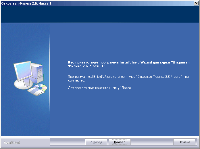 Вставьте диск с электронным изданием (ЭИ) «Открытая Физика 2.6. Часть 1» в CD-привод. Если вы не устанавливали курс на данный компьютер ранее, то программа установки запустится сама. При этом на вашем компьютере откроется окно инсталлятора.