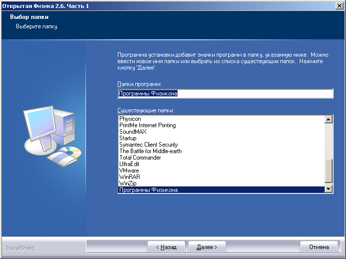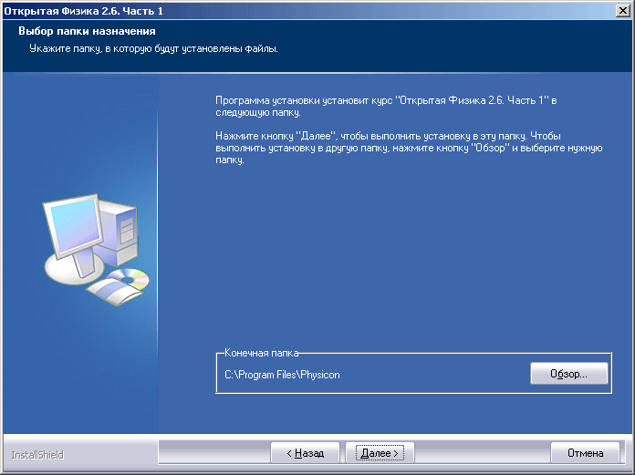Для продолжения инсталляции нажмите кнопку . Программа установки предложит вам инсталлировать курс в папку C:\Program Files\Physicon. Если вы хотите установить курс на другой диск или в другую папку, то нажмите кнопку и выберите соответствующие диск и папку. Имя папки, в которую будет устанавливаться курс, не должно содержать специальные символы.