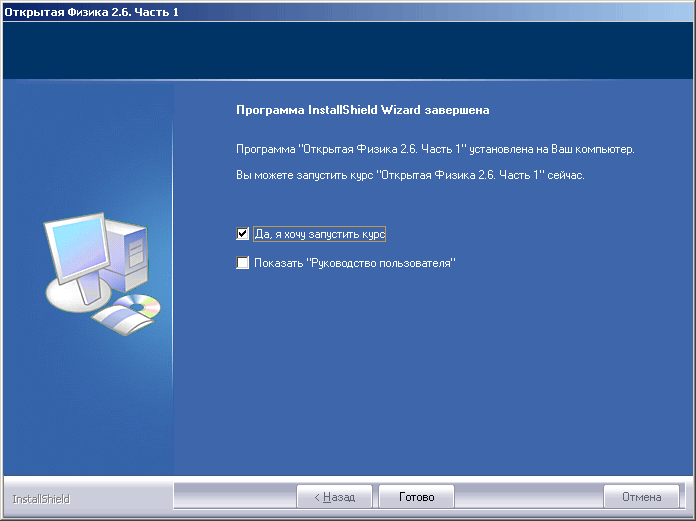 После завершения всех подготовительных процедур и установки дополнительных программ инсталлятор в течение 5–20 минут (в зависимости от быстродействия вашего компьютера) установит курс. После окончания установки программа выдаст соответствующее сообщение и предложит вам запустить курс «Открытая Физика 2.6. Часть 1». Если вы не предполагаете запускать курс сразу же, то снимите флажок с выключателя .