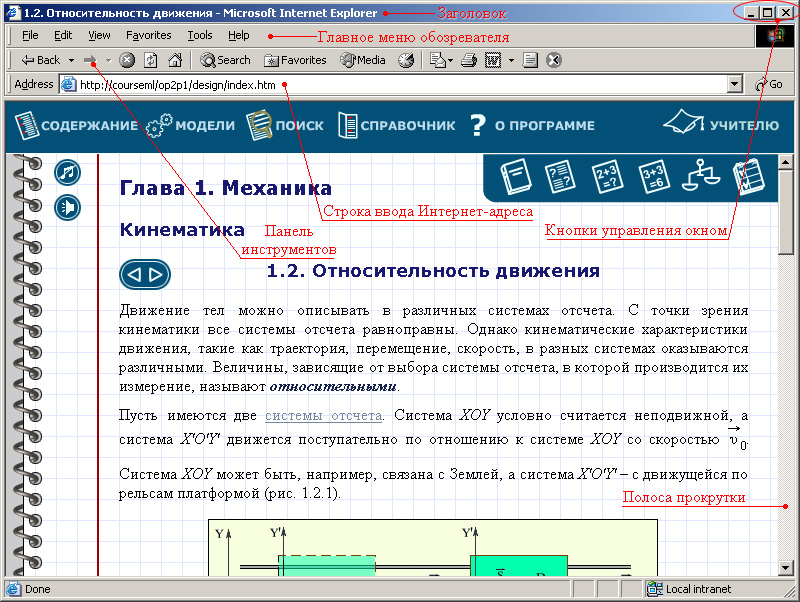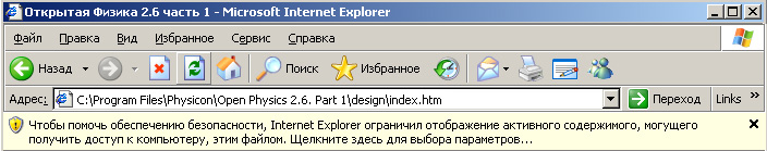 Компьютерный курс «Открытая Физика 2.6. Часть 1» оформлен в виде набора web-страниц, для просмотра которых используется обозреватель Internet Explorer. Подобные страницы вы могли видеть, путешествуя по Интернет. Однако для работы с данным курсом вам не обязательно иметь доступ в Интернет. Все страницы курса будут установлены на ваш компьютер при инсталляции.