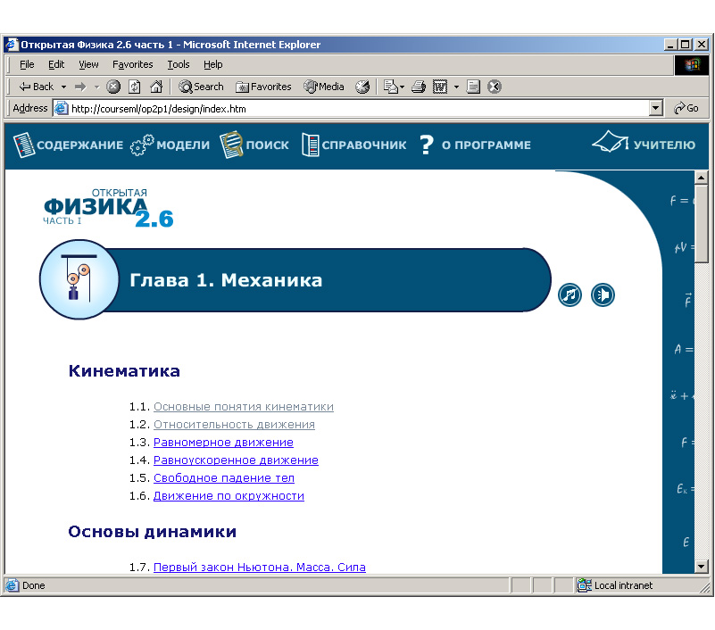Раздел Содержание включает в себя иллюстрированный учебник и контрольные вопросы и задачи по физике, разбитые по темам. На список этих тем, выполненный в виде структурированного содержания, пользователь и попадает при загрузке раздела. Тематически курс разбит на 3 главы. Главы состоят из разделов, разделы – из параграфов.