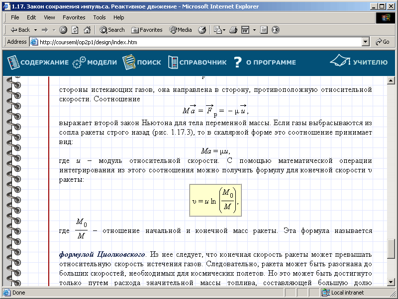 Активными являются и экраны интерактивных моделей. После щелчка по экрану вы попадаете на описание соответствующей модели, в которую интегрирована работающая модель. Интерактивные модели позволяют показать исследуемое явление значительно более наглядно; особенно хорошо использовать интерактивные модели для проведения лекций и презентаций.
