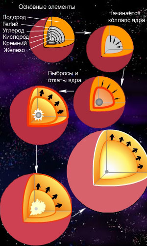 Сверхновыми называются звезды, взрывающиеся и достигающие в максимуме абсолютной звездной величины от –11m до –18m. Плотное ядро коллапсирует, увлекая за собой в свободное падение к центру наружные слои звезды. Когда ядро сильно уплотняется, его сжатие прекращается, и на верхние слои обрушивается встречная ударная волна, а также выплескивается энергия огромного числа нейтрино. В результате оболочка разлетается со скоростью 10 000 км/с, обнажая нейтронную звезду либо черную дыру. При вспышке сверхновой выделяется энергия 1046 Дж.